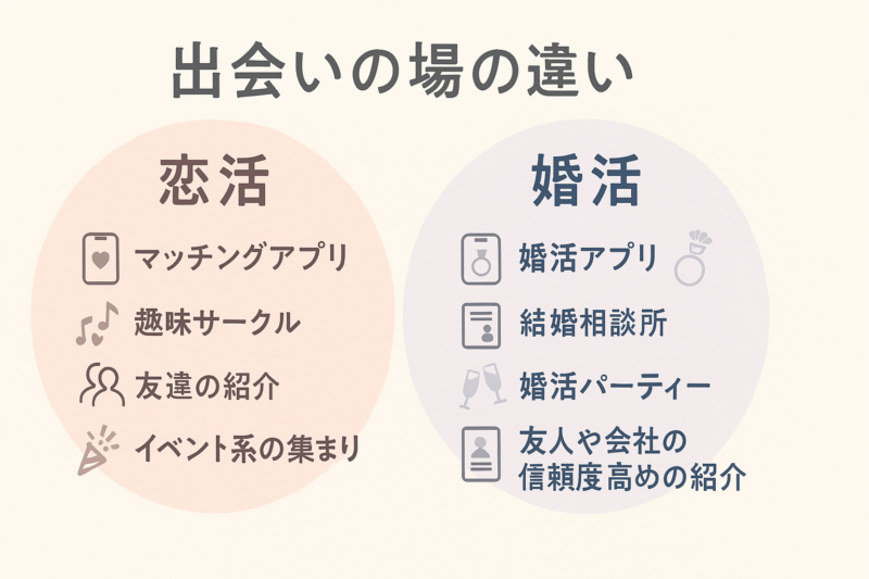 ここでは恋活・婚活での出会い場を比較して、自分が動きやすい環境を見つける手がかりになりますね。